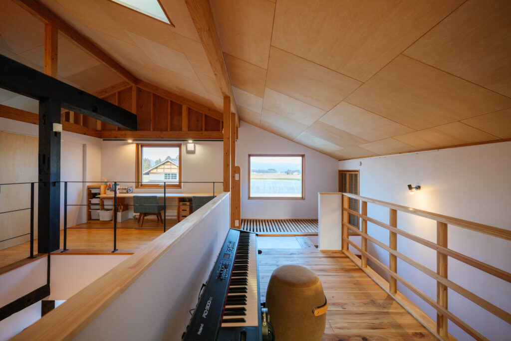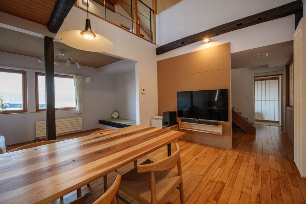 19年前の力強い梁が見守る中、吹き抜けの下では孫たちが走り回り、上階からは